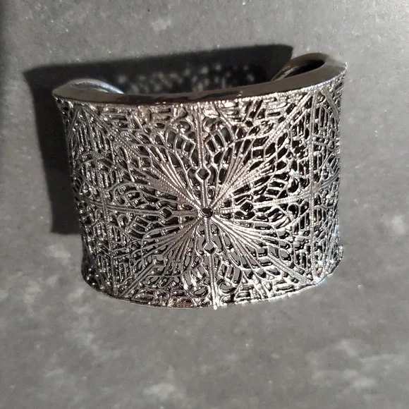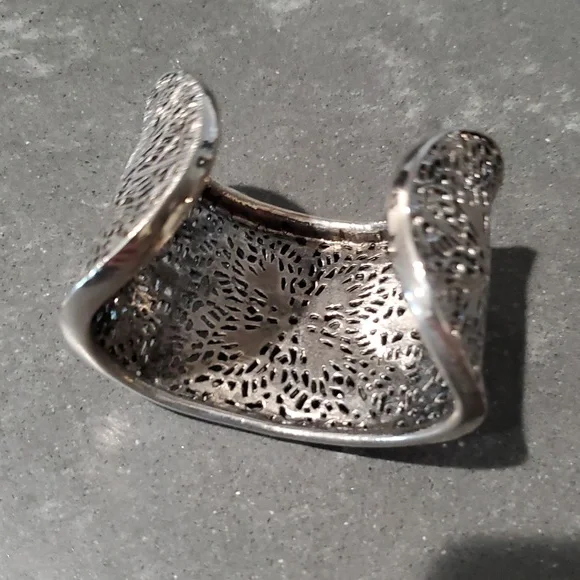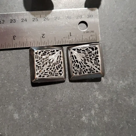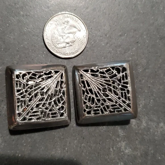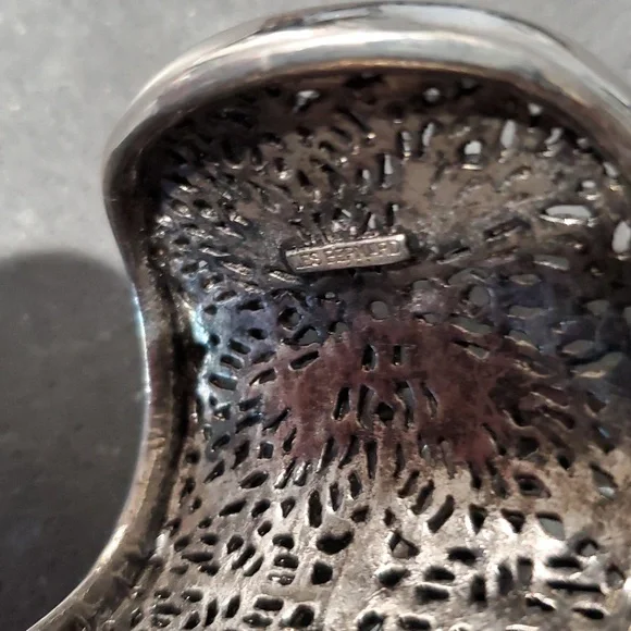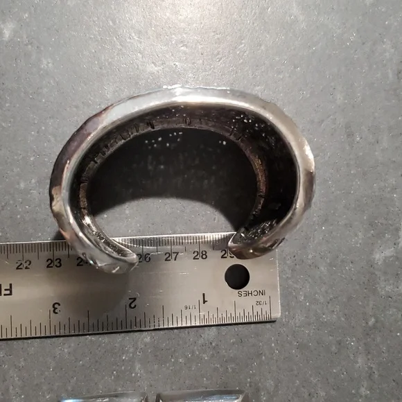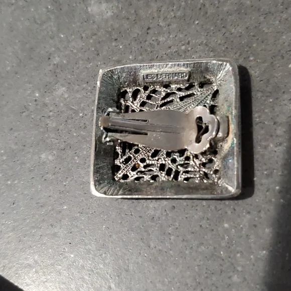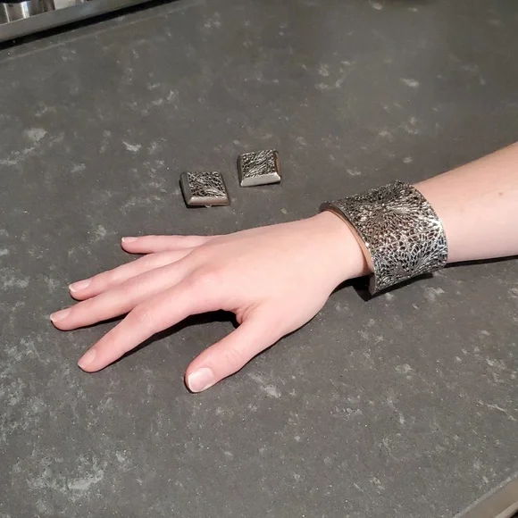 Excellent condition, original owner. RARE.Les Bernard signed set.Thick cuff & earrings. Design on earrings are mirror images, true sign of quality pieces.May be silver coated, no stamp, but does tarnish slightly. No cleaning attempted.Cuff, see measurements for size.Earrings are clip on. Meant to hang square, not diagonally.Stored: bedroom jewelry side table.
