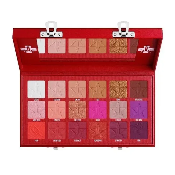 New Jeffree Star BLOOD SUGAR PALETTEOur iconic Blood Sugar palette features 18 striking eyeshadows and pressed pigments. This palette is serving three luxurious finishes: matte, metallic, and foil. Wrapped in red faux leather with a metal clasp closure.Cruelty-Free & VeganHow to Use:Formula is highly-pigmented, use a light hand when picking up product or tap excess pigment off makeup brush before applying, a little goes a long way!Use darker shades in the crease, and lighter shades along the brow bone and inner corders of the eye.Apply desired shade on eye lid along the lash line or lower lash line to create an eye liner look.For a pop of color, apply shimmer or metallic shades to the center of eyelid. Shades:Matte: Glucose, Sugar Cane, Cake Mix, Ouch, Intravenous, Tongue Pop, Cavity, O Positive, Root Canal, Prick, Cherry Soda, Fresh Meat, Extraction, ComaMetallic: Donor, Candy Floss, Sweetener, Blood SugarPressed Pigment: Sugar Cane, Tongue Pop, Cavity, O Positive, Root Canal, Prick, Cherry Soda, Fresh Meat, Extraction, Coma, Sweetener, Blood Sugar*certain pigments may cause irritation or staining if used around the eyes.
