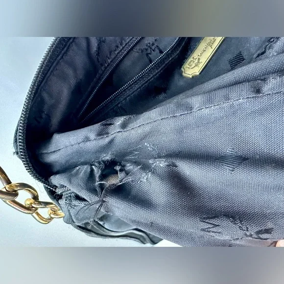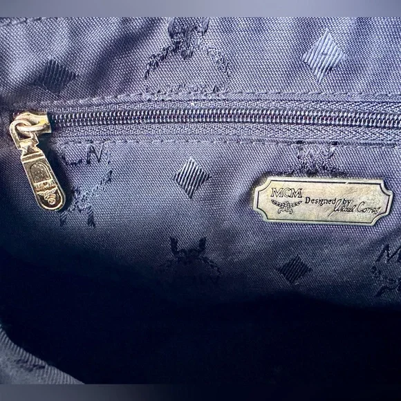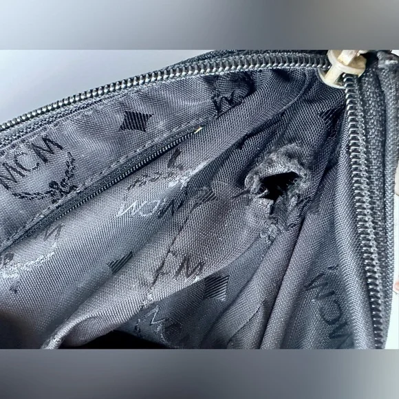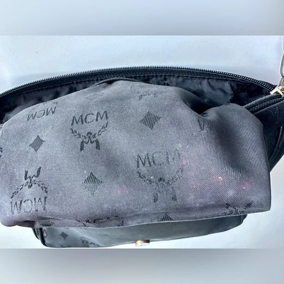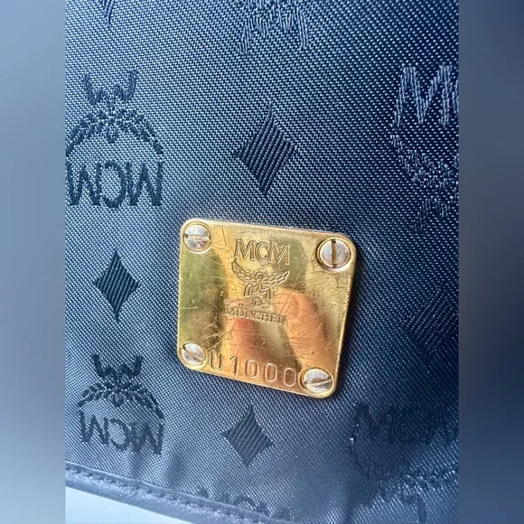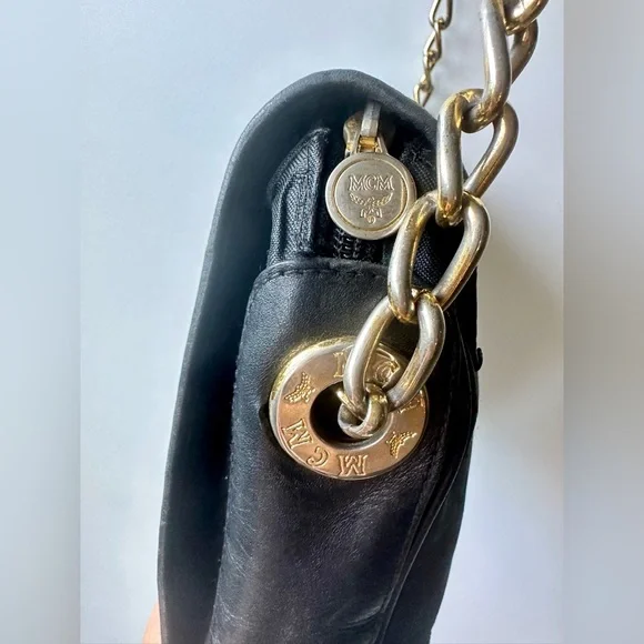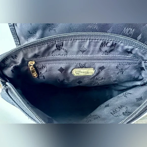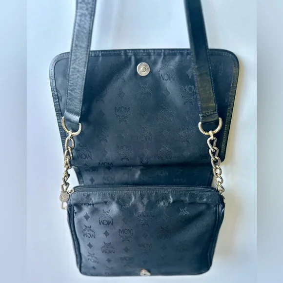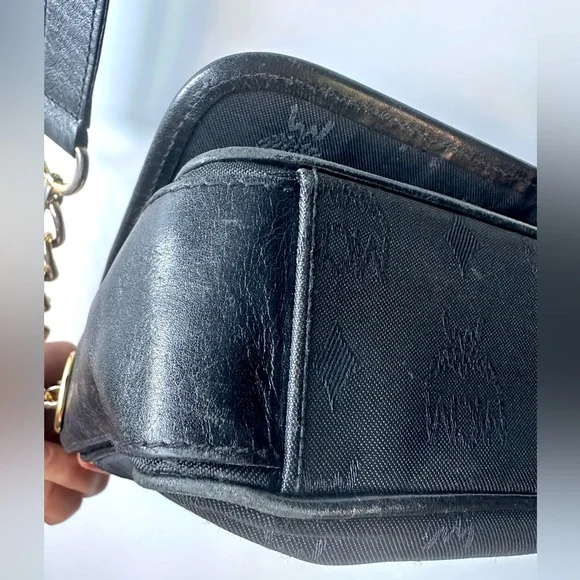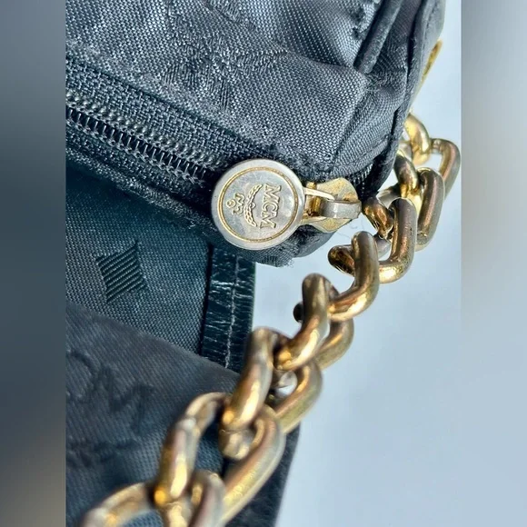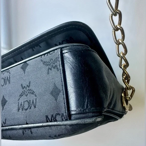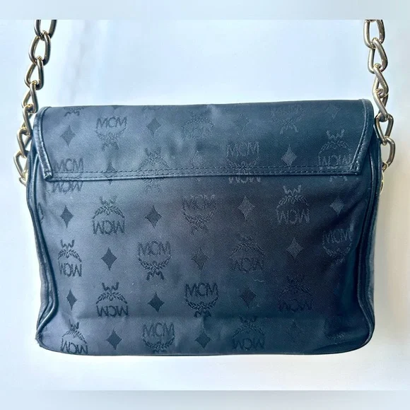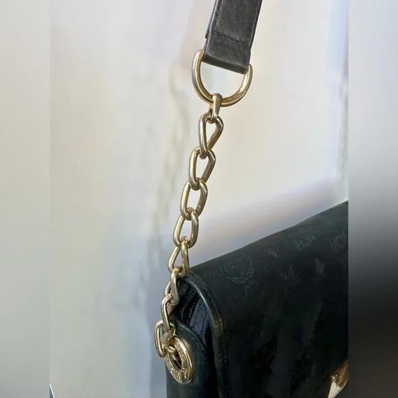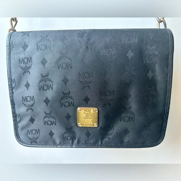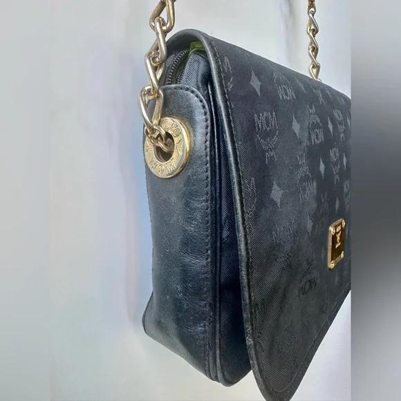 Authentic vintage MCM monogram shoulder bagTimeless, classic, versatile!Nylon and lamb leather in blackGold tone hardware Flap with magnetic snapZipper Zipped pocket inside The bag has been loved a lot and used a lot, so it shows noticeable signs of wear:Scratching on the front logo plaque Wear on the lower leather edges of the bag Wear on the metal chain and on the zipper pullTwo holes inside on the lining Make-up stains inside the pocket (should be easy to clean)Please see pictures for more detail on the condition!No stains outside.Size: 11”x8”x3”Handle drop 18”