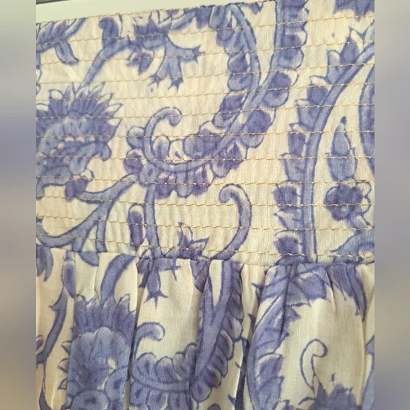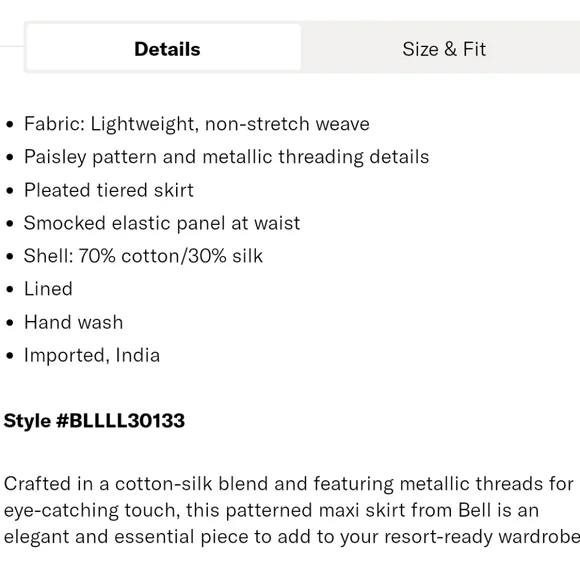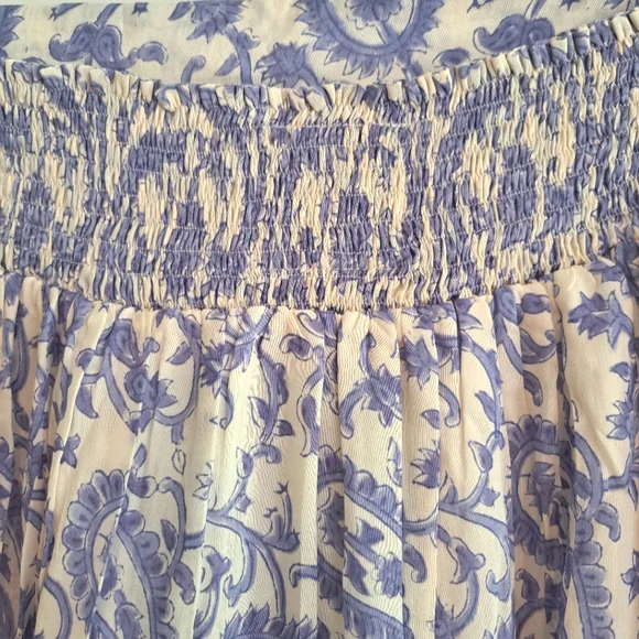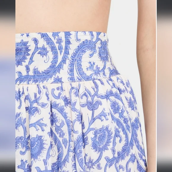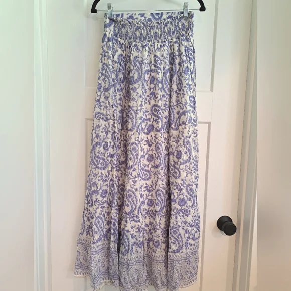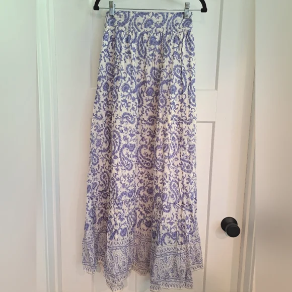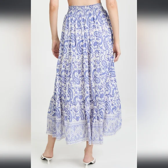 NWT Veronica Maxi Skirt (Blue Paisley) - BELLLined, lightweight maxi skirt made with a luxurious silk-cotton blend. Waistline has a flat band in front and a shirred stretch section in back, along with gold metallic accent stitching. Classically beautiful white background with a blue paisley print.70% cotton, 30% silk Size Medium New with tags. Smoke-free home.Size chart pic provided with measurement information. Please see actual product photos for garment color/detail, which may vary slightly from stock photos. All sales are final per Posh policy. Thank you!